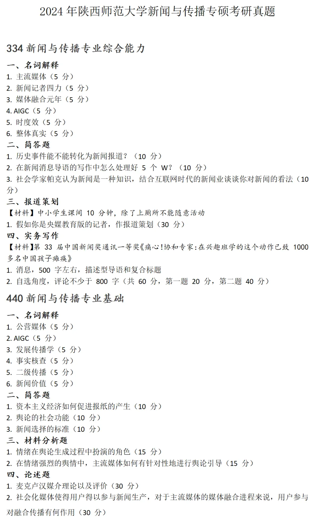 陕西师范大学新闻与传播考研真题2024