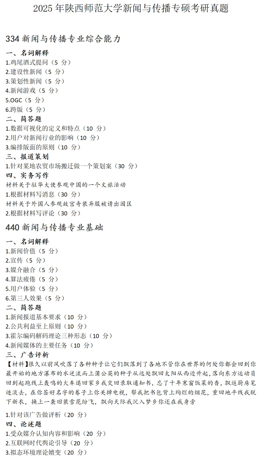 陕西师范大学新闻与传播考研真题2016-2025历年
