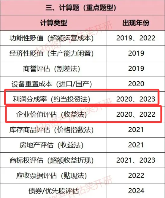 集中考查对核心评估模型的熟练应用能力,特别是约当投资分成法评估无形资产利润分成率,以及收益法评估非上市普通股价值。这两类计算是无形资产和企业价值评估中的经典难点。
