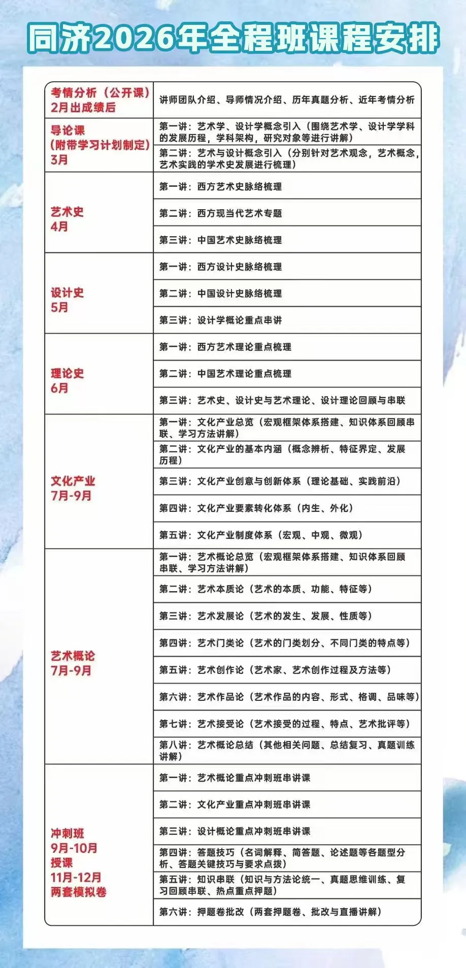 依托同济设计与数字文化产业(原艺术学理论)的学科传承与出题逻辑,课程以“全覆盖知识点、强针对性训练、高命中热点” 为核心,兼顾基础理论与前沿动态,帮助跨考、零基础考生快速搭建知识体系,让有基础考生实现能力拔高,轻松应对灵活考题。