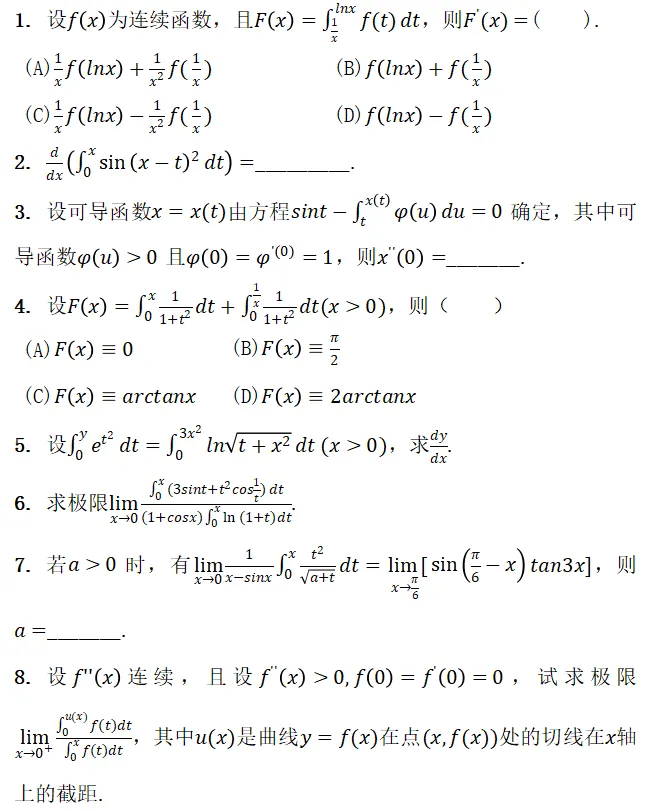 我们今天看到的这组题目,每一道都在考验我们对积分上限函数求导法则的理解与应用能力。这些题目看似复杂,实则都围绕着一个核心思想:如何正确处理积分限为函数时的求导问题。
