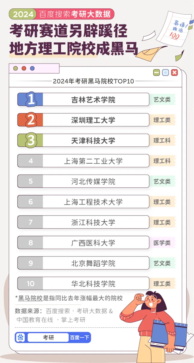 值得关注的是,今年出现了吉林艺术学院、深圳理工大学等考研黑马院校,这些院校与去年相比报考人数涨幅较大,显示出其在特色专业等方面的吸引力日益增强。