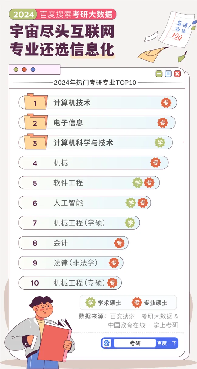 根据最新考研大数据,当前最受追捧的考研专业,计算机技术、电子信息、计算机科学与技术排名前三,前十专业中互联网相关专业仍然占据主流。