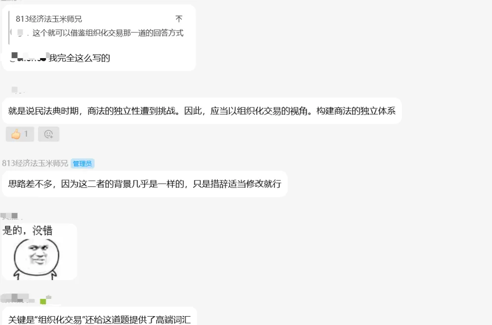 考虑到考研初试商法部分的论述题常为商法总论部分内容,且中南法学近几年比较显著的成果即为发表在《中国法学》期刊上的与商法独立有关的内容。因此在模拟考试期间,结合该篇论文,对商法独立性的相关内容进行过前期模拟,最后的考题虽与模拟试题有所出入,但考生仍可以论文涉及内容为切入点回答,且论文的背景逻辑与真题的背景相似,可以相互借鉴。