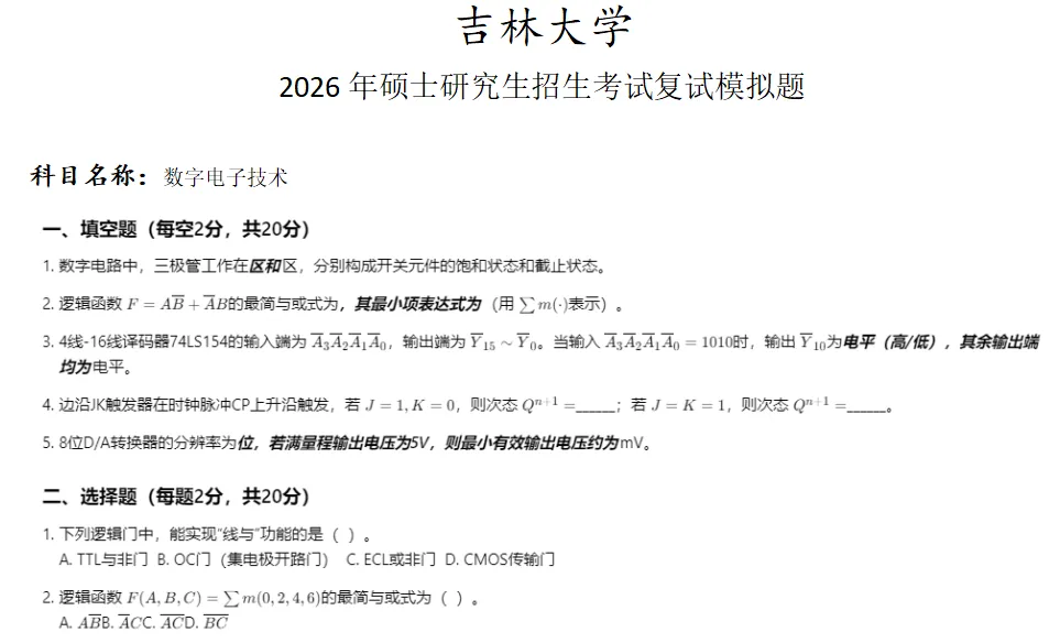 吉林大学数字电子技术考研复试真题模拟含答案