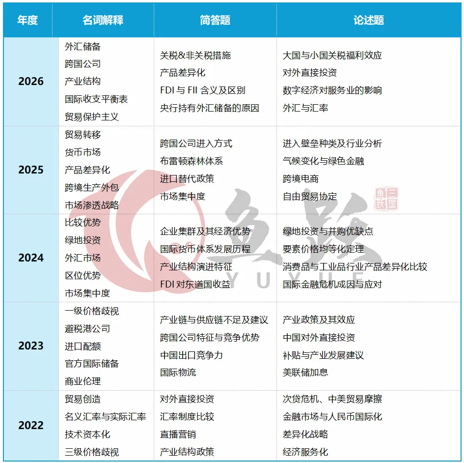 ➡️2️⃣6️⃣届难度继续回升,论述题继续保持“理论+热点+案例”的高阶命题风格,“大国与小国关税福利效应”属于国际贸易理论高阶考点,“数字经济对服务业的影响”需结合产业经济学与国际商务双重视角作答,综合难度较高。