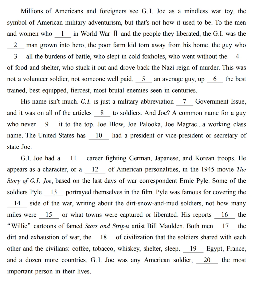 文章围绕二战时期美国士兵的通用形象G.I. Joe展开,G.I. 原本是“Government Issue(政府配发)”的军事缩写,后来代指普通美军士兵。文中将这一形象与著名军旅漫画家比尔・莫尔登笔下的“威利”漫画人物对比,两者都真实展现了战争的艰苦与疲惫,以及士兵们在战火中共享的咖啡、烟草、住所等零星文明生活片段。对当时被美军支援或解放的埃及、法国等众多国家而言,G.I. Joe 就是最普通的美国大兵,而在战争那个特殊时刻,他们也是当地民众心中最重要的人。