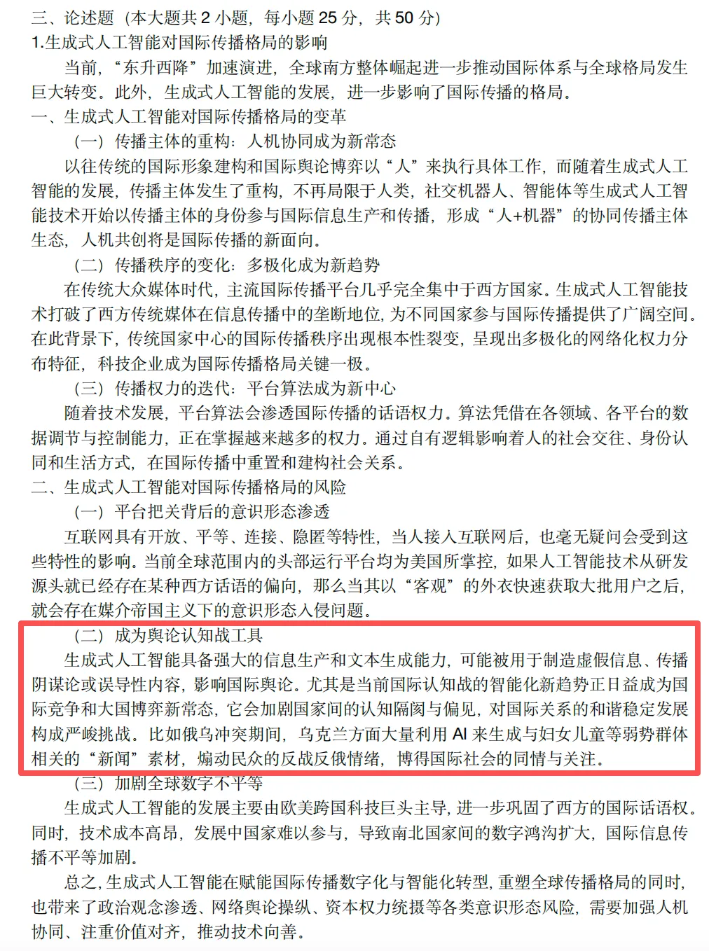 8、从舆论战到认知战,背后还是智能技术在驱动。基于网络的全球信息联动、全球民众的动员、人工智能技术的广泛使用等,舆论战超越了传统宣传和民众动员,而转为更加复杂的认知战。我们在浙传模拟考中谈到生成式人工智能对国际传播格局的风险时,就有提到会成为舆论认知战工具。