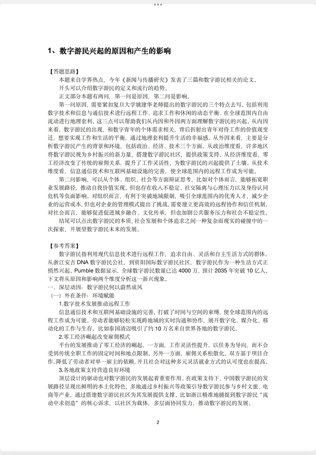 (2)数字游民也是这两年学界研究的热点,《新闻与传播研究》2025年发表了3篇和数字游民相关的论文。数字游民也是重要的社会热点,被评为2025年十大流行语。数字游民和北师大老师关注的媒介化社会相关,也可以从传播政治经济学派的角度切入。去年北师大保研就考了“谈谈对数字游民的看法”。数字游民本身也是跨学科的概念,多个学科都在研究。因此,第二问数字游民对传播学研究的价值,是老师希望考生从本学科研究者的角度思考这一议题,较为学术。