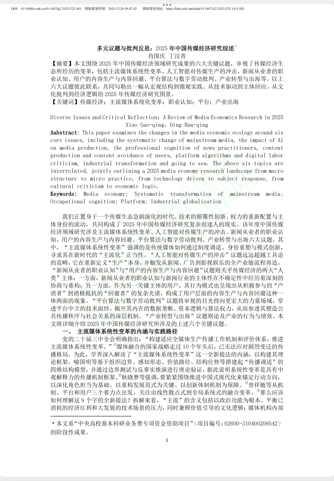 5、推荐阅读丁汉青老师写的《多元议题与批判反思:2025 年中国传媒经济研究综述》,论文中谈到的人工智能对传媒生产的冲击和重塑,传媒产业的本土转型与全球出海,分别对应技术和国际两个角度,对于回答传媒经济相关的题目,极具启发性。