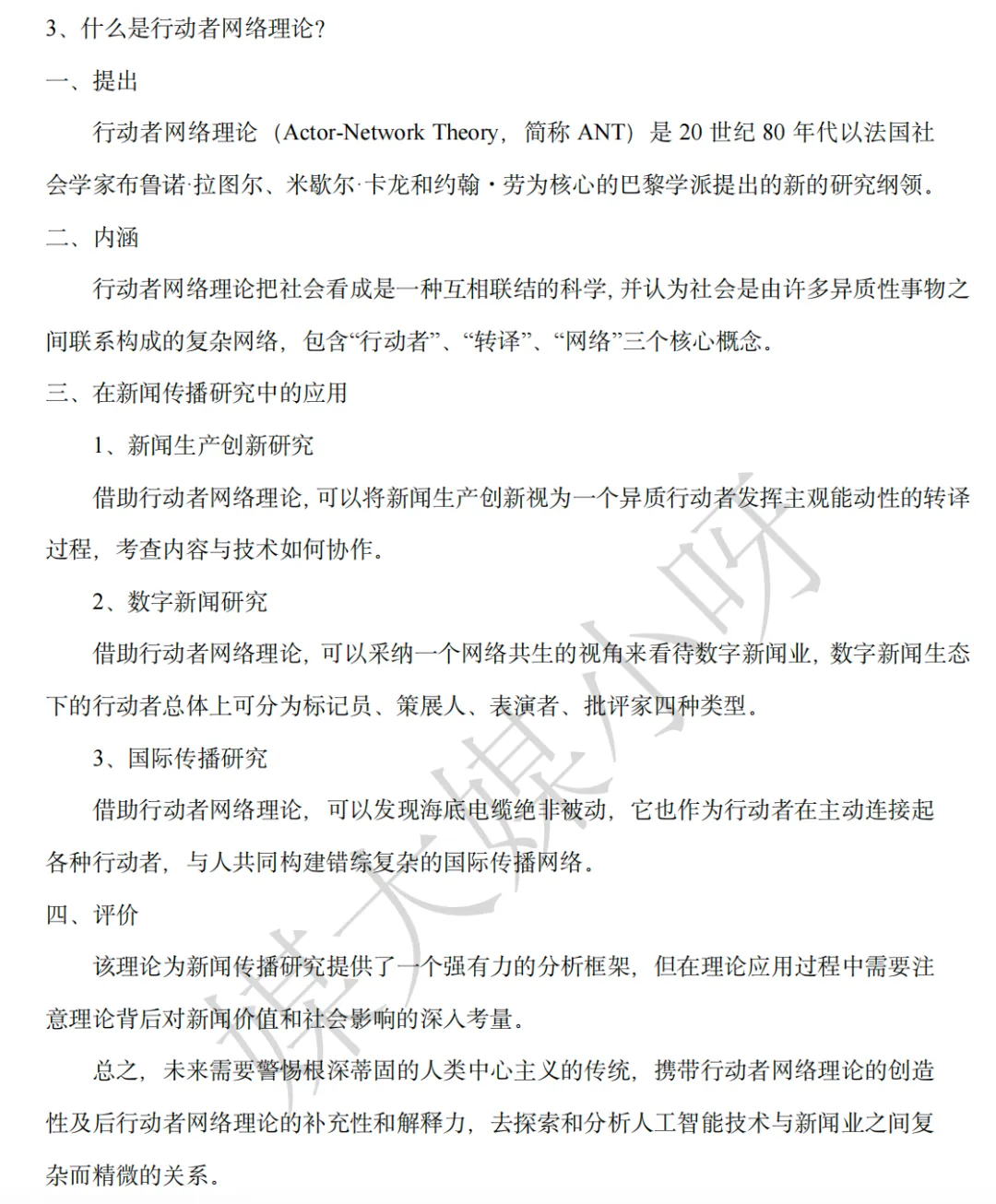 1、本题有两问,第一问谈谈对行动者网络理论的理解,比较简单。这个理论是这几年新传考研的高频考点,基本都会提前准备,此前在深大的模拟中也有出题。包括相关概念计算机为社会行动者(Computers are Social Actors, CASA)也是这几年的高频考点。
