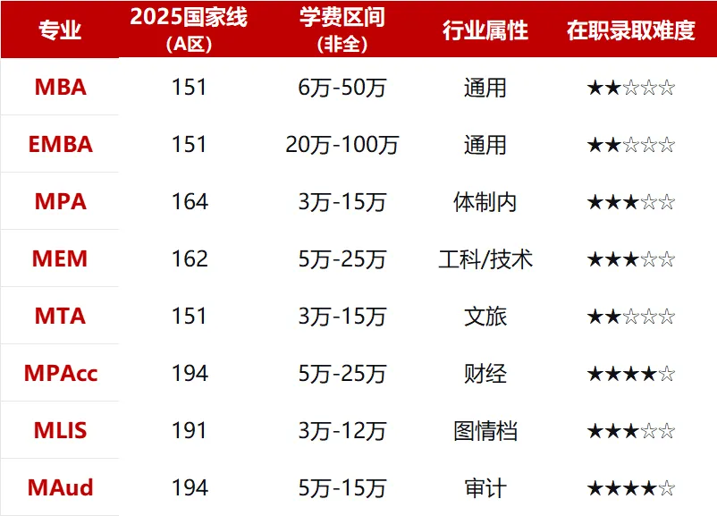 ★★★☆☆ 中等难度:过线是底线,部分名校需高出5-15分;MPA/MEM/MLIS —— 性价比高,体制内或技术岗刚需,竞争温和
