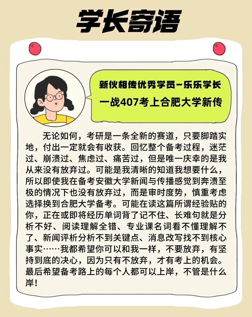 大家好,我是乐乐,本科就读于安徽某二本网络与新媒体专业。在校期间,无大厂实习经历,无科研经历,无奖学金,英语四级第四次才考过去,三月份开始学习备考安徽大学新闻与传播,八月份经过深思熟虑选择换到合肥大学新闻与传播,25考研初试以407分(其中政治79分,英语61分,专业课267分)排名第二上岸合肥大学。