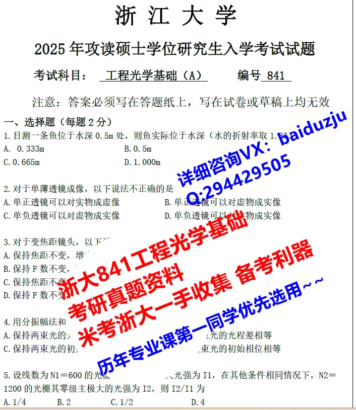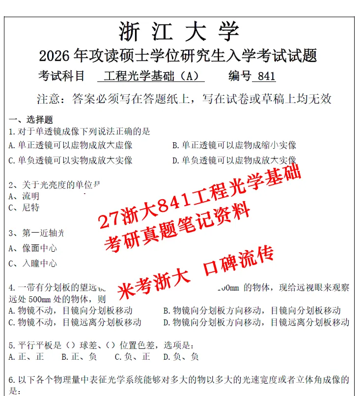 27浙大841工程光学基础考研真题光工初复试资料+学长答疑