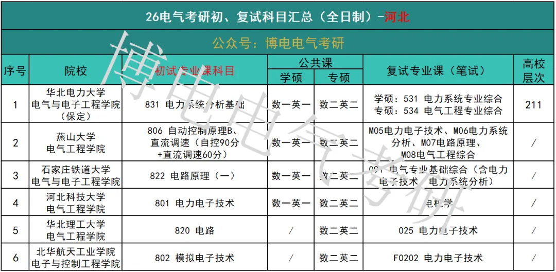 今天介绍的是仅招收专硕、初试专业课平均分高达130分的高校——华北理工大学的最新考研录取与就业情况分析。26届河北省电气考研院校初、复试科目整理如下。其中,华北理工大学仅招收电气专硕!其初试专业课考察820 电路,复试笔试科目考察025 电力电子技术。