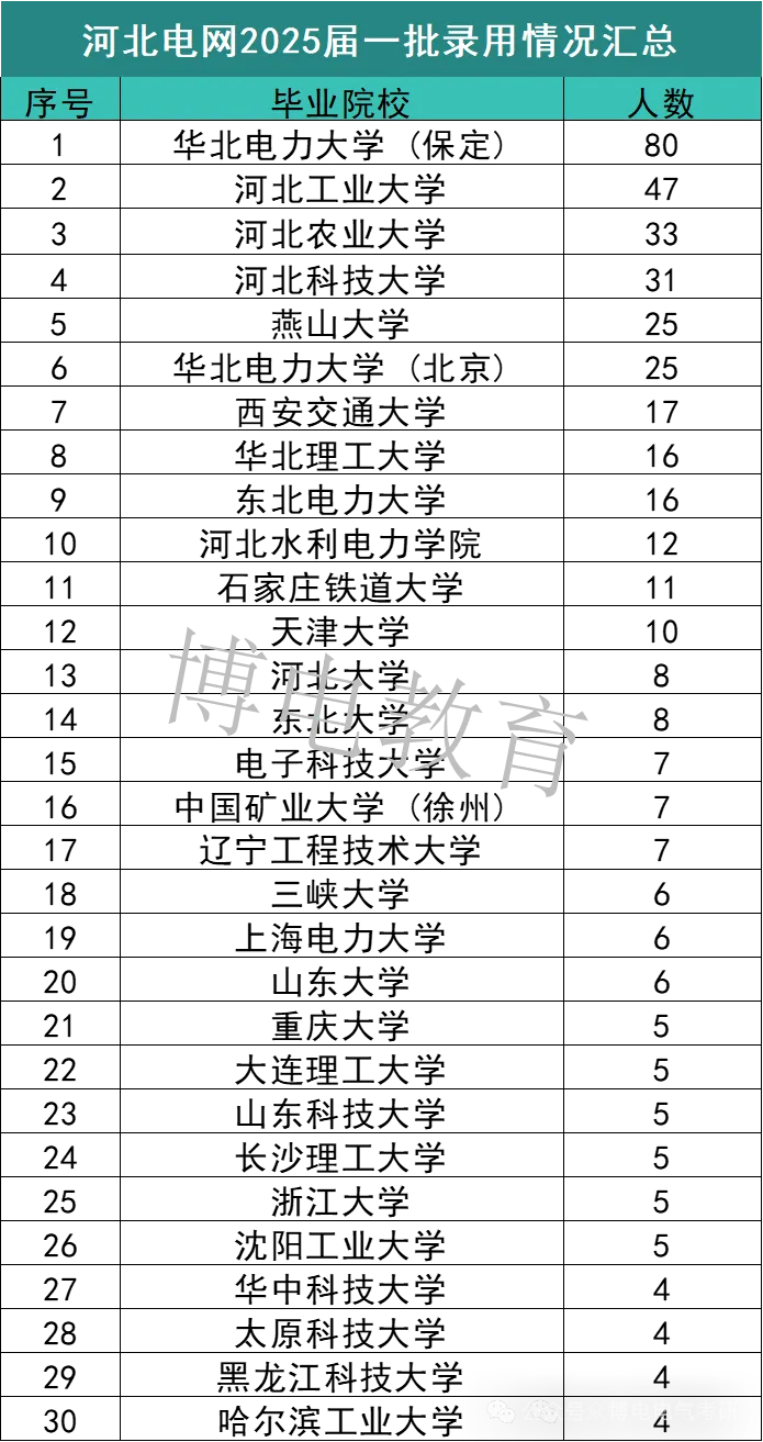 河北电网2025届一批录用情况汇总如下:其中华北电力大学(保定)、河北工业大学、河北农业大学的录取人数排名前三!华北电力大学(保定)大学录取人数最多!共计录取80人,河北工业大学录取47人!河北农业大学录取33人!另外,华北理工大学25一批共计有16人入职河北电网!排名第8!