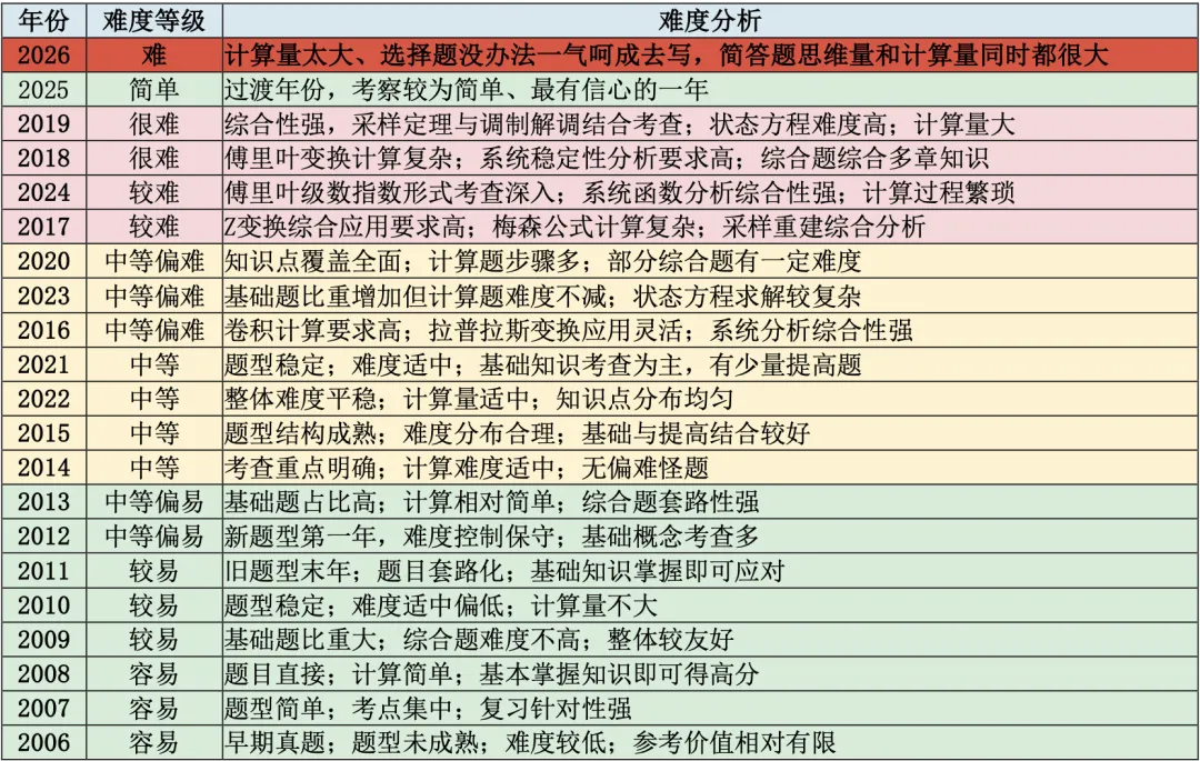 26年真题难度较大,与25年形成鲜明对比——25年作为题型改革的第一年难度偏低,而26年之后难度趋于稳定。全卷共29题,包含20道选择题(每题2分)、6道简答题(每题10分)和3道解答题(共计50分)。选择题考察知识点较为灵活,每年包含若干必考内容,如六性判断、奇异信号的计算、卷积、傅里叶变换的性质、拉普拉斯变换和Z变换的滤波特性、稳定性等性质判断以及零极点分析,同时也会穿插一些特色题目,如自相关函数、状态方程的求解及概念辨析题,整体难度中等。简答题是824每年难题最集中的部分,创新度高且计算量大,主要考察考生在考场上的临场发挥与综合应用能力。解答题本身难度不高,但计算量偏大,26年已有部分同学因时间不足未能作答完毕,建议大家考前合理规划答题时间。解答题主要考察的内容包括利用拉普拉斯变换分析电路、状态方程、卷积运算以及梅森公式等。