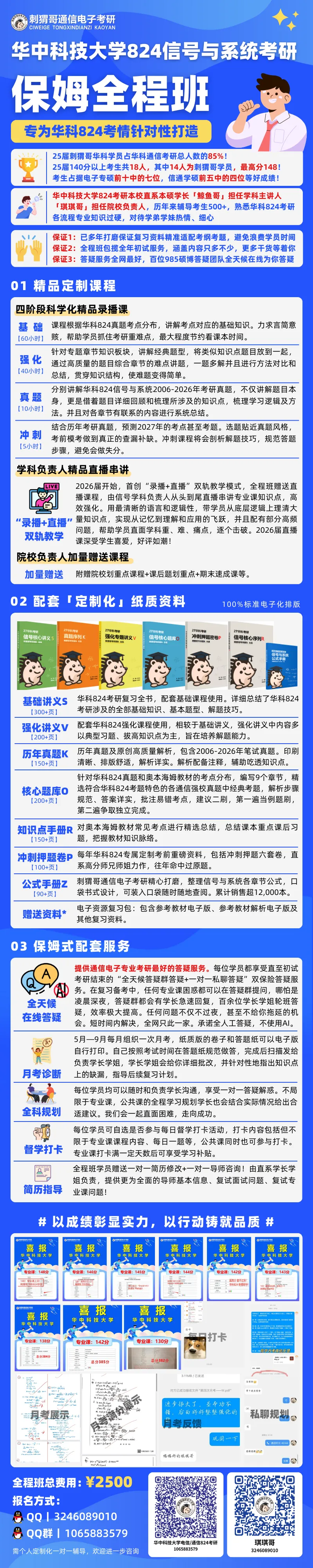 华中科技大学从资料到课程均为华科本硕直系学长亲自完成,并且严格按照华科的考纲逐题讲解。华中科技大学824信号与系统25届通信考研85%以上考生均来自刺猬哥考研团队。电信学院电子信息专硕前10,有7名考生来自刺猬哥考研团队;信通学硕前5名考生有4名考生来自刺猬哥考研团队;电科学硕上岸考生6人,其中四人是刺猬哥团队学员。网安学院共录取17人,有13人为刺猬哥学员。录取考生中824 专业课共18名考生取得超过140分的优秀成绩,其中14名考生来自刺猬哥考研团队,48名考生取得超过130分的优秀成绩,其中39名考生来自刺猬哥考研团队;刺猬哥考研团队学员专业课最高分更是取得148的好成绩。