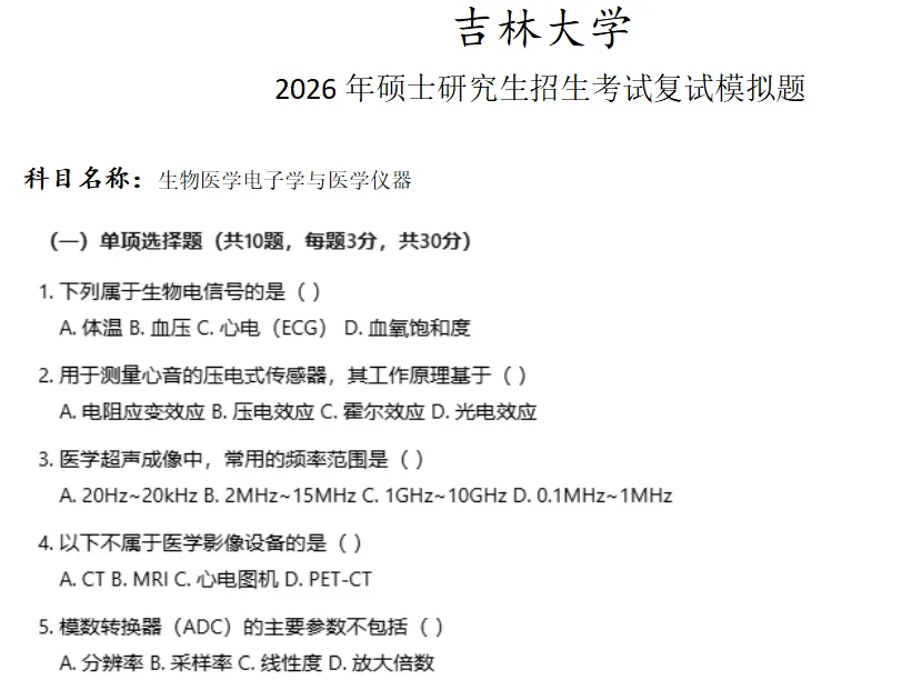 吉林大学生物医学电子学与医学仪器考研复试真题模拟含答案