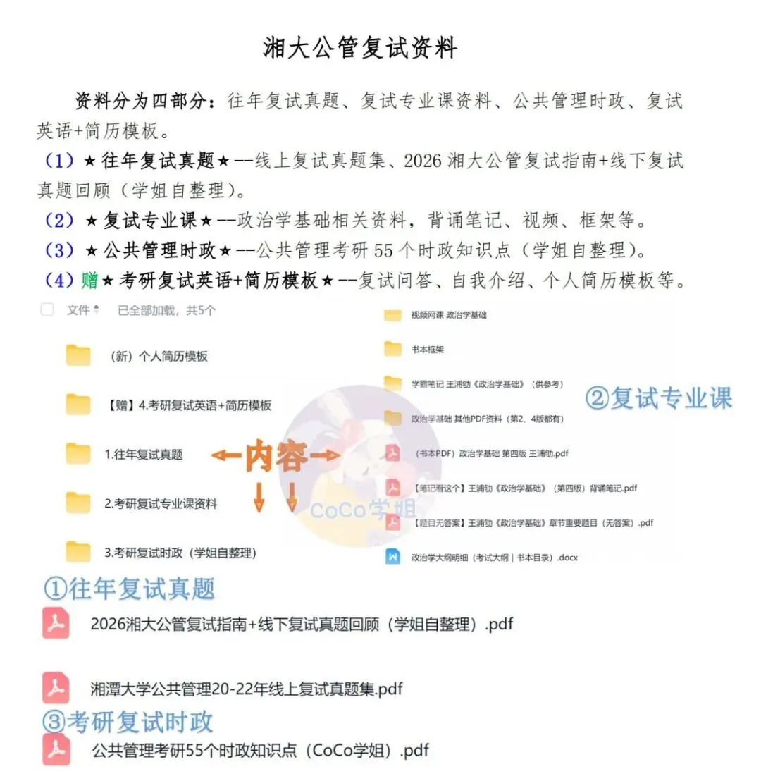 资料分为四部分:往年复试真题、复试专业课资料、公共管理时政、复试英语+简历模板。