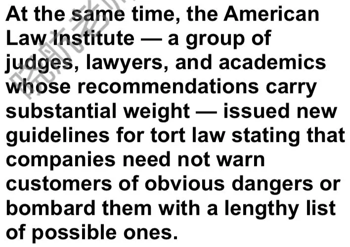 尽管个人伤害的指控一如既往地继续着,但有些法庭已开始站到被告一方,特别是在处理那些有警示语也无法避免伤害的案件时。