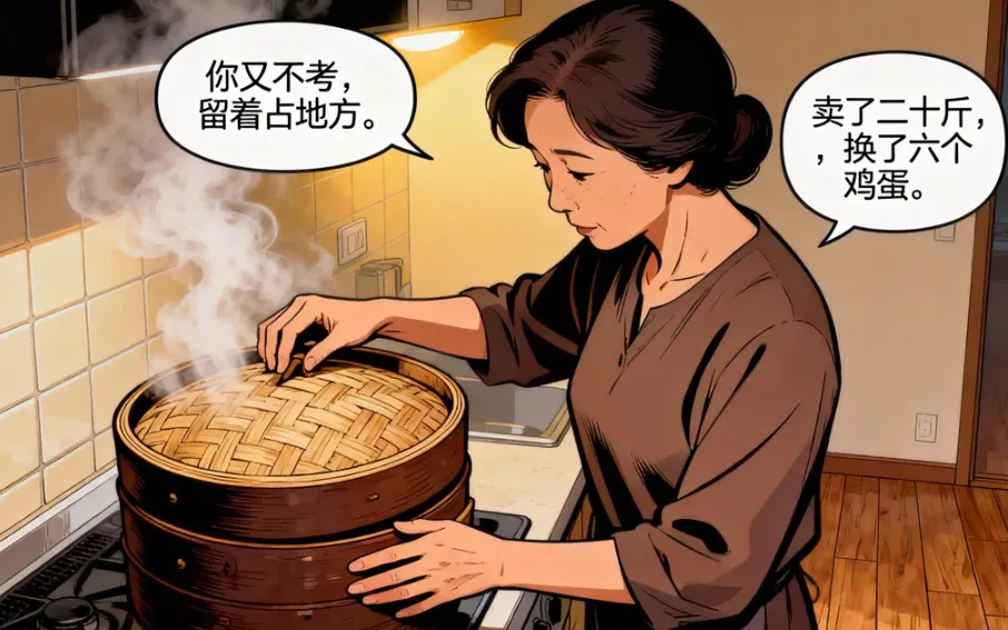 "你又不考,留着占地方。"我妈正揭着蒸笼,头都没抬,"卖了二十斤,换了六个鸡蛋。"