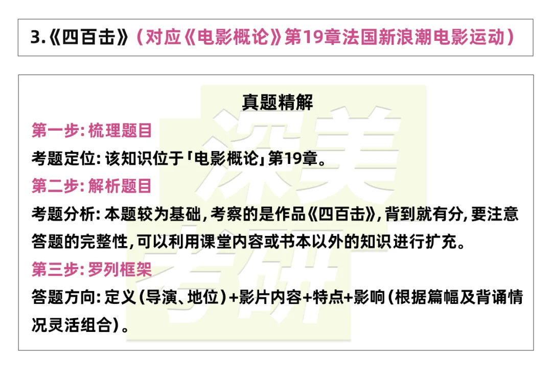 《四百下》是法国导演弗朗索瓦·特吕弗于1959年执导的长片处女作,被公认为法国新浪潮电影运动的开山之作与宣言性作品。(定义)影片以半自传的方式,讲述13岁少年安托万·杜瓦内尔在学校、家庭与街头之间游荡,最终因偷窃被送入少管所并成功逃脱的故事,通过一个边缘少年的视角,深刻揭示了教育体制的僵化、成人世界的冷漠与个体自由的渴望。(影片内容)作为新浪潮美学的典范,《四百下》彻底打破了传统电影的叙事与拍摄规则。影片大量采用实景拍摄,运用自然光线与手持摄影,以充满即兴感的镜头语言捕捉生活的真实质感;其标志性的跟随长镜头将角色的情感与物理空间融为一体,创造出前所未有的心理沉浸感;叙事结构松散而富有诗意,摒弃了戏剧化的矛盾编排,代之以日常片段的积累,最终以安托万面对镜头茫然无措的定格特写作为开放式结局,强化了存在的孤独与未决状态。(特点)《四百下》不仅是特吕弗个人“作者电影”的起点,也开启了影史罕见的“安托万系列”五部曲,追踪同一角色跨越二十年的成长。它以其真挚的情感、革新的形式与对社会规范的温和反叛,定义了新浪潮的精神内核——电影应当成为个人表达与生命体验的直接载体。(影响)