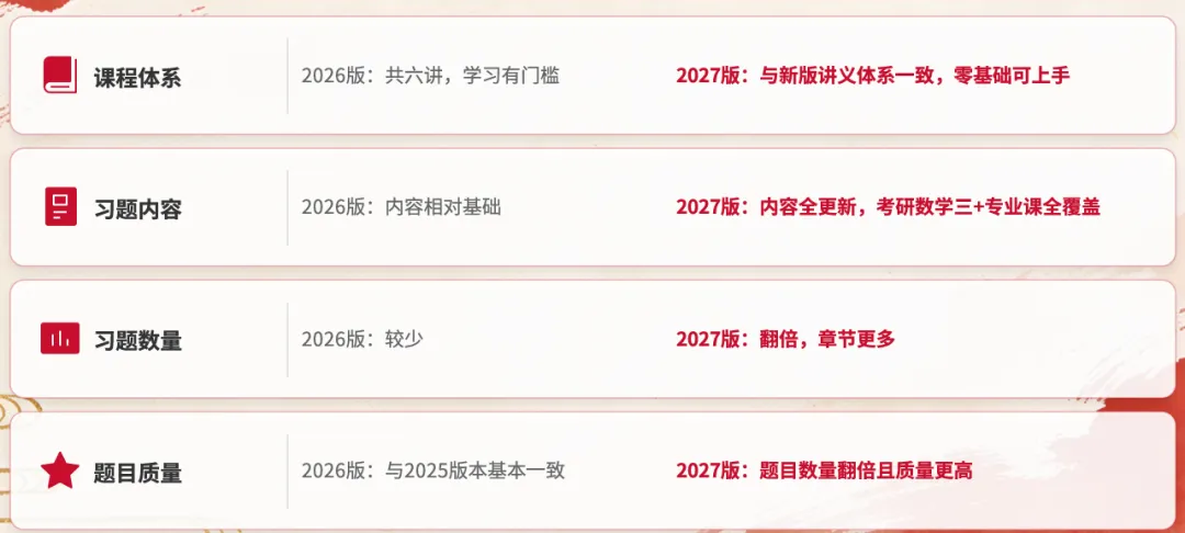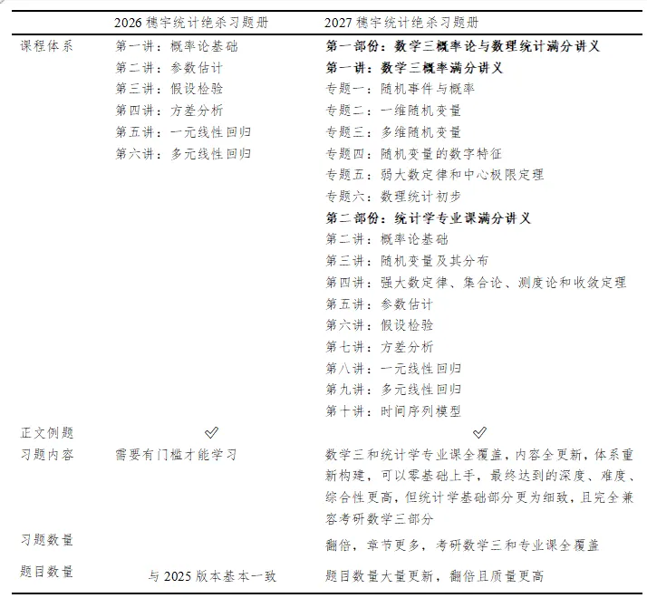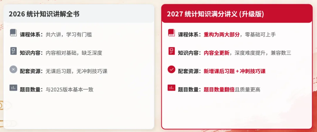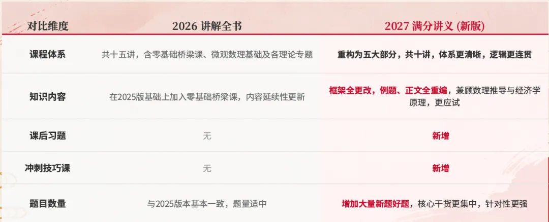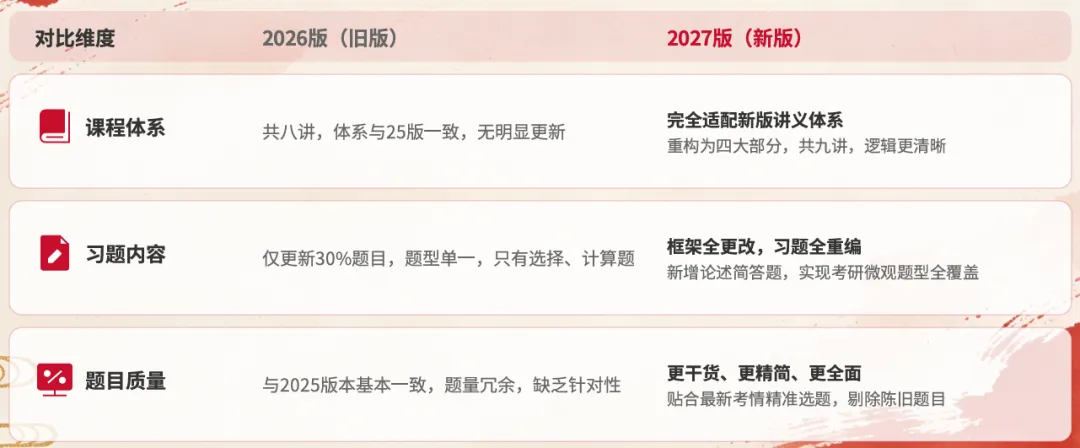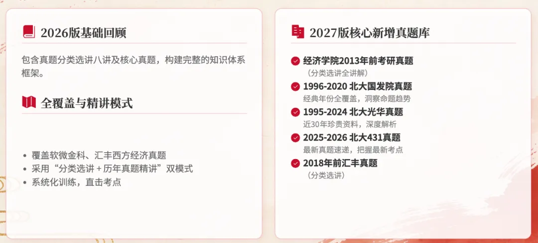深耕北大经济学、金融考研辅导领域,我们始终以贴合考情、打磨精品、助力上岸为初心,深耕细作每一份备考资料。2027年,我们对微观、宏观、统计三大核心板块的讲义、习题册,以及经济、统计真题册完成全维度重磅升级,8本资料全新迭代(其中统计真题册为今年新增),从体系重构到内容精编,从题型拓展到真题更新,全方位适配27考研命题趋势,为你的上岸之路筑牢根基。