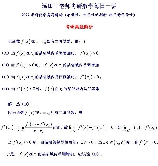 2022考研数学真题解析(单调性、凹凸性的判断+极限的保号性)