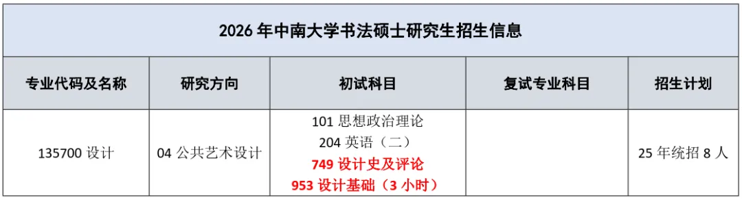953设计基础真题分析:近几年中南大学设计基础(书法方向)考查都是两体创作(篆隶楷选一、行草选一),26年更改纸张为A3宣纸,25年及以前为四尺对开竖式。内容一般为古诗和书论。备考时需做好小字创作训练。
