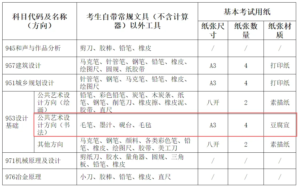 953设计基础:考生需自备毛笔、墨汁、砚台、毛毡