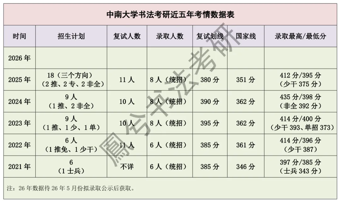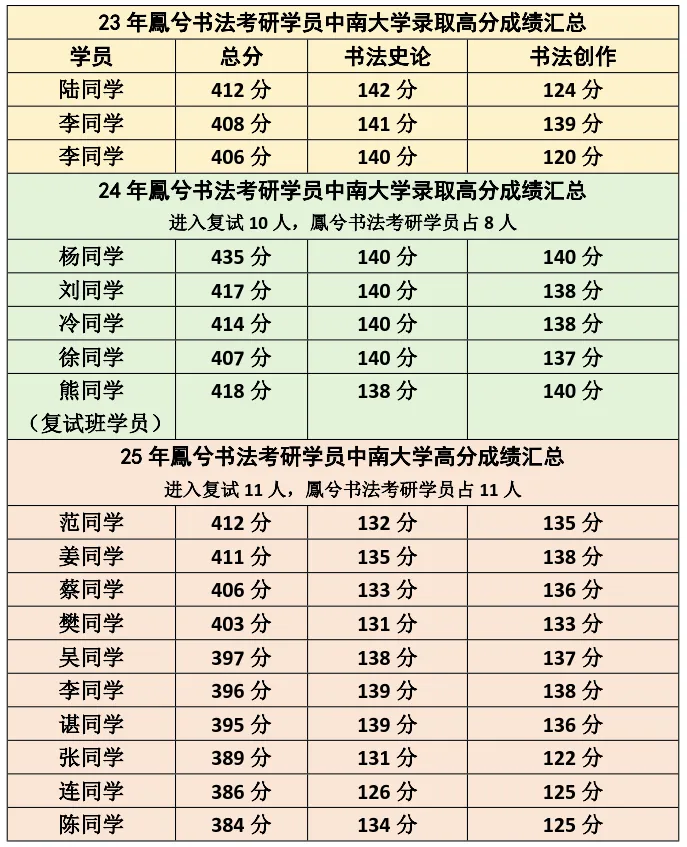 2026年中南大学建筑与设计艺术学院招收设计专业公共艺术设计(含书法)方向硕士研究生。25年鳳兮书法考研中南大学专项学员11人进入复试(复试线380分),包揽中南大学书法考研复试。其中初试最高分412分,400分以上学员4人,395分以上学员7人。设计史及评论(书法史论)最高分139分,设计基础(书法创作)最高分138分。24年鳳兮书法考研备考中南大学学员8人进入复试(复试线390分)407分以上高分5人。总分最高分435分,设计史及评论单科最高分142分(总分未过线),6人单科140分(并列第二)。24年书法总计招生8人,鳯兮书法考研7位学员录取(其中一位为复试班学员),以下为鳳兮书法考研整理的相关资讯,供27年备考学生参考,本年度鳳兮书法考研开设中南大学书法考研专项全程课程(中南专项,包揽复试 | 2027年中南大学书法考研专项课程招生简章(两门仅需4200元)),助力27年备考中南大学书法考研学子,详情请加微信咨询。