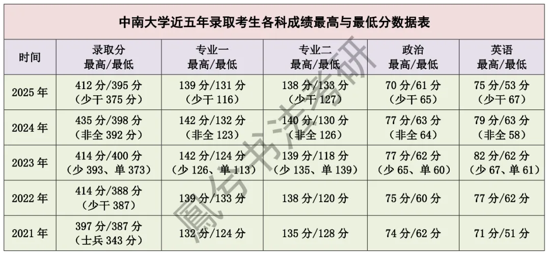 中南大学属于自主划线院校,复试划线单科(政治英语)25年45分,24年及以前为50分;复试线总分25年380分,进入复试11人,录取8人,录取最低分395分(少干375分)。24年390分,进入复试10人,录取8人,录取最低分398分(非全392分)。23年395分,进入复试10人,录取8人,录取最低分400分(少干393分,单招373分)。可见中南大学总分要求较高,但有意向备考中南大学的准研究生,也不必畏难,相比于其他院校,中南大学专业给分相对较高。现将录取考试初试各科成绩最高与最低分统计如下,供备考学生参考。