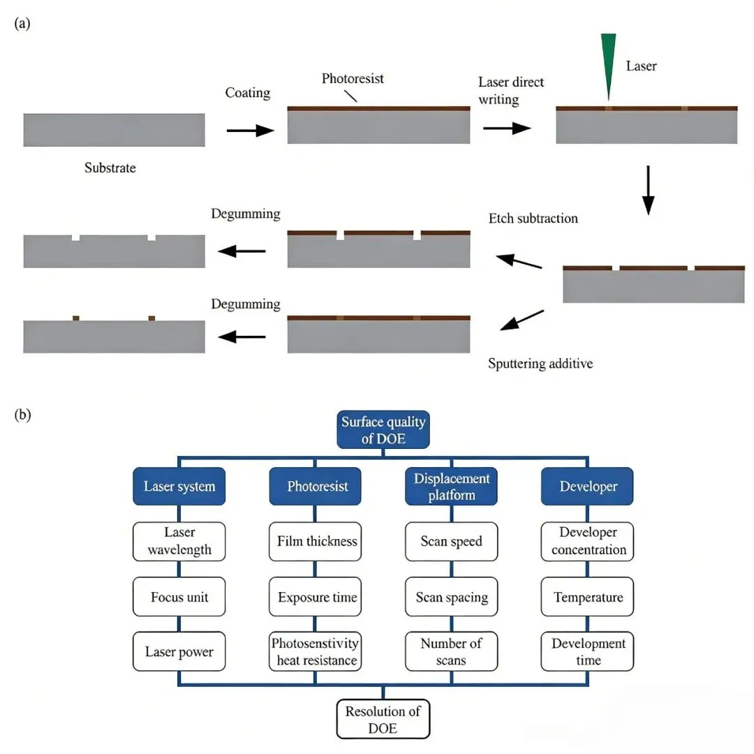 (a) 激光直写技术工艺过程示意图;(b) 影响DOE制备质量的主要因素