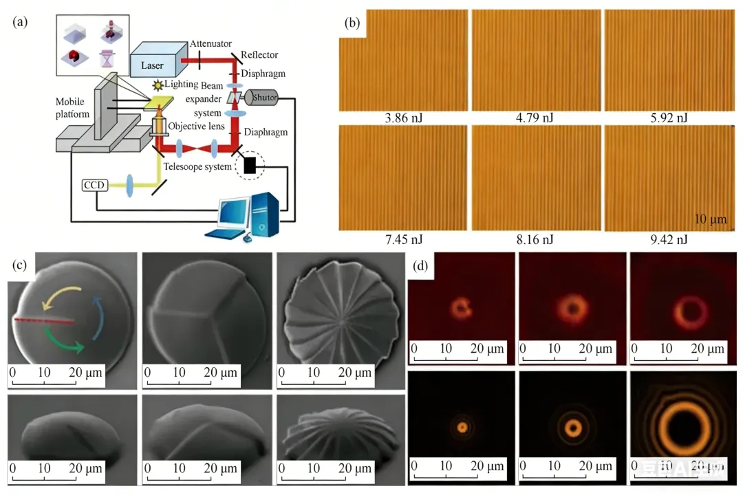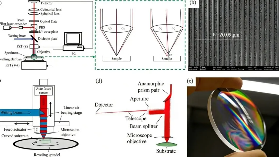 (c) 激光直写制备曲面衍射结构系统示意图;