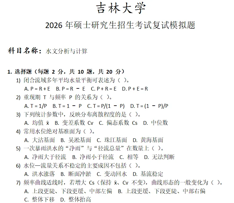吉林大学水文分析与计算考研复试真题模拟含答案