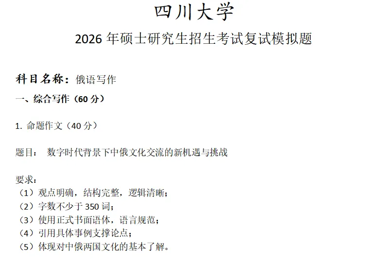 四川大学俄语写作考研复试真题模拟