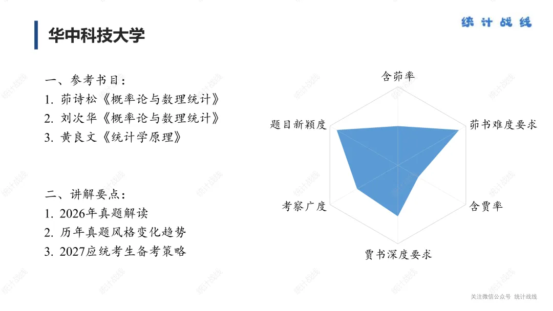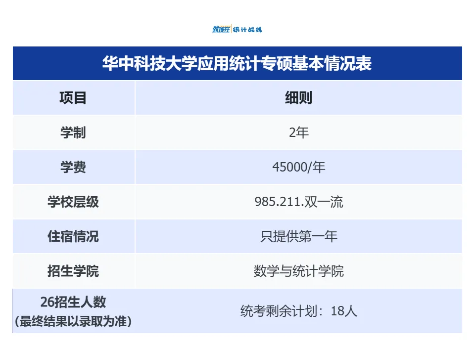 华中科技大学位于湖北省武汉市,喻家山麓,东湖之畔,是国内顶尖高校,整体实力很强,其应用统计由数学与统计学院招生,研究方向偏数学,近年来有扩招趋势,连续两年录取人数增加。