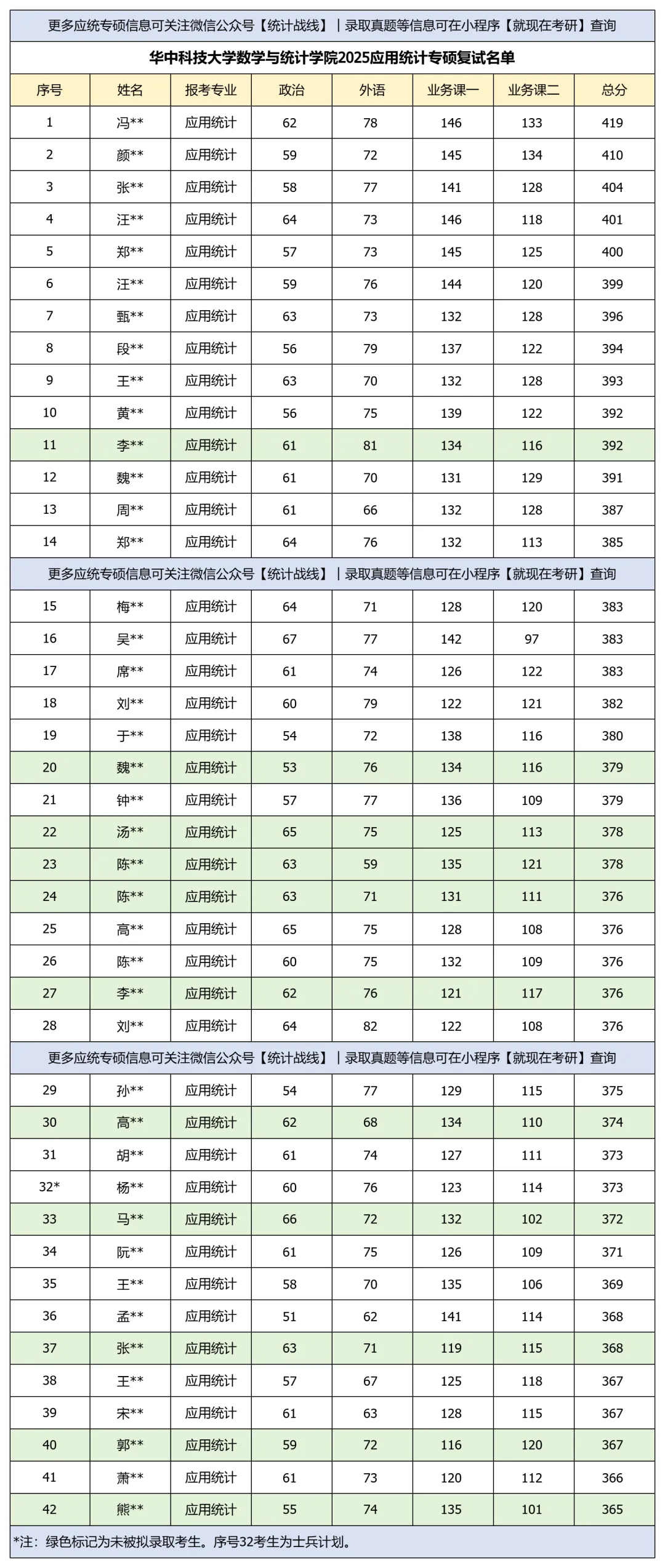 25华科应统详细复试录取名单(含初试各科成绩分数和复试淘汰情况):