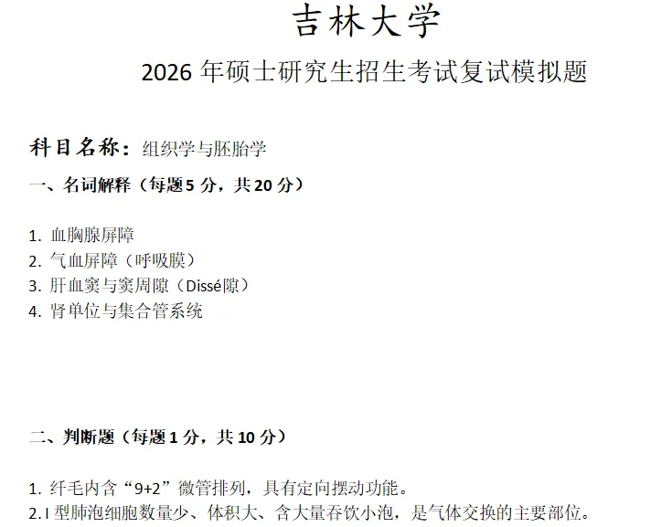 吉林大学组织学与胚胎学考研复试真题模拟含答案