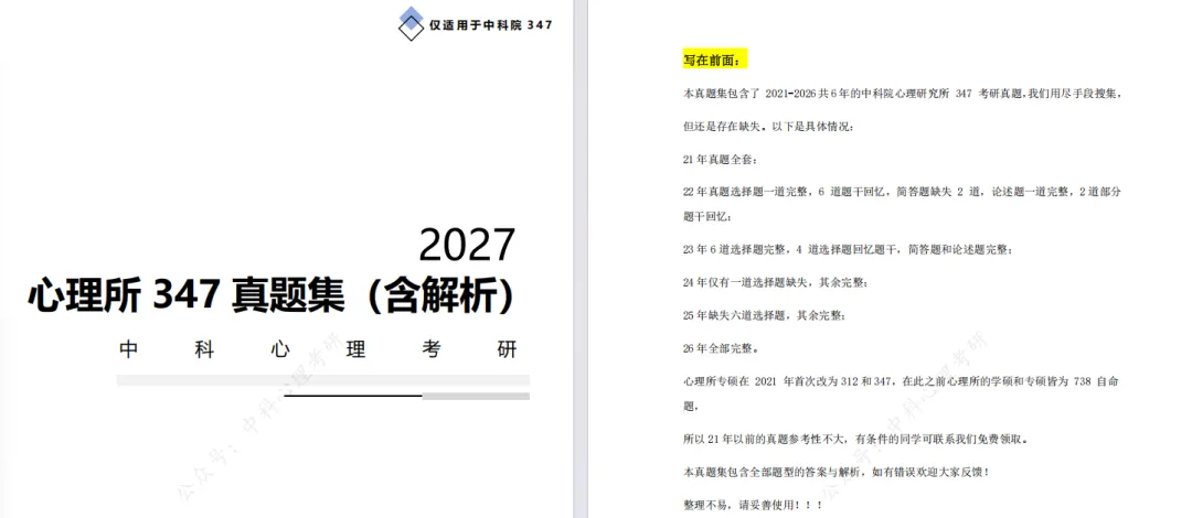 @27考生,中科院心理所347专硕考研初试资料已更新完成......2027版考研纸质资料八件套:知识精讲(笔记)、简答题背诵手册、思维导图、347考点总结、2021年至2026年的347考研真题集、347刷题册、347必背实验范式、347模拟卷。注:此资料仅适用于备考中国科学院心理研究所(中国科学院大学心理学系)347应用心理专硕的同学哦!本真题集包含了 2021-2026 共 6 年的中科院心理研究所 347 考研真题,我们用尽手段搜集,但还是存在缺失。22 年真题选择题一道完整,6 道题干回忆,简答题缺失 2 道,论述题一道完整,2 道部分题干回忆;23 年 6 道选择题完整,4 道选择题回忆题干,简答题和论述题完整;心理所专硕在 2021 年首次改为 312 和 347,在此之前心理所的学硕和专硕皆为 738 自命题,所以 21 年以前的真题参考性不大,有条件的同学可联系我们免费领取。本真题集包含全部题型的答案与解析,如有错误欢迎大家反馈!购买347全套资料(8套),赠送下列资料(电子版)!全程班的同学资料无需再次购买,半程班、课时班及其他班型请联系我们查看最新折扣!如果你缺乏自制力,需要研友的陪伴;如果你专业课的学习感到困难;如果你目前还存在许多疑问;如果你感到情绪低落,复习压力大;如果你想要拿到更好的成绩,请联系我们!有很多同学自学也能400+,那是我羡慕不来的能力!