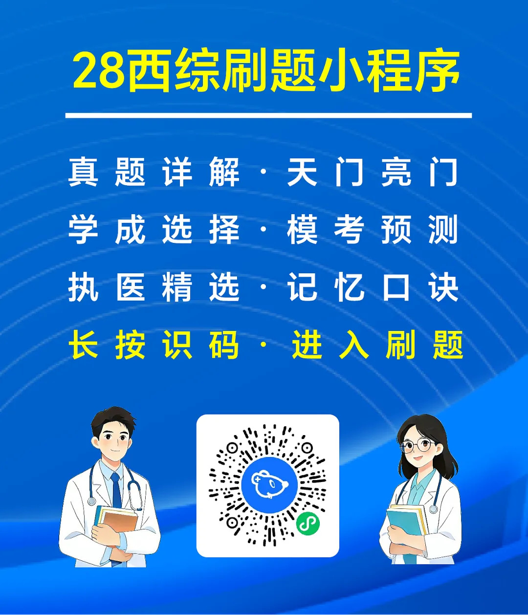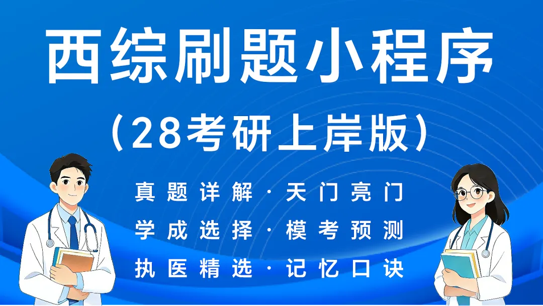 包含近30年西综真题,逐题逐项超详解析。我们在参考权威教材及辅导书的基础上,又独家进行了详细的补充说明,解析分为【精简版】和【详细版】,以点带面横扫知识点,满足不同学习层次的用户需求,保证是市面上西综真题解析最详细的。解析分为四块内容,学霸笔记+思维导图+讲义内容+超详解析,实现全方位解析,能够充分满足天门学子的刷题需求。我们比其他西综小程序解析更全面,保证每一道题目都有相应的解析,不会出现虎头蛇尾的这种情况。解析分为四块内容,学霸笔记+思维导图+讲义内容+超详解析,实现全方位解析,能够充分满足亮门学子的刷题需求。其他西综小程序有天门题库,没有亮门题库,我们都包含。解析全面,保证每一道题目都有相应的解析,帮助学生吃透知识点。解析分为三块内容,逐题逐项文字详解+思维导图+讲义内容。目前西综考研竞争越来越激烈,都在冲刺高分。学生已不满足于只刷西综真题。学成选择题已经是众多西综考研学生的必刷题型。28西综小程序上的学成选择题,每个科目每个章节全覆盖,题目丰富且全面。解析里面除了加相应的名师版思维导图和讲义内容。我们还在参考权威教材及辅导书的基础上,又独家进行了详细的逐题逐项文字解析,帮助考研学生吃透知识点,这是市面上其他同类小程序根本就没有的,也是我们这个西综小程序的一大亮点。5. 各大模考预测卷(28\27\26\25考研都有)买一年题库,刷三年试题!如果只有西综真题,那么这个题库是司空见惯,平平无奇的。市面上每年还有很多的万人模考卷和冲刺预测卷,我们将常见的试卷都录入到了题库当中,且每套试卷都增加了考试模式。海量试题,让大家在一个地方花最少的价钱,既能吃饱又能吃好。没有解析的试题就是耍流氓!这些试题市面上有解析的,我们有;市面上没有文字解析的,我们也有!我们在参考权威教材及辅导书的基础上,独家进行了详细的逐题逐项文字解析,帮助考研学生吃透知识点。其中天门试卷,解析分为两块内容,文字详解+天门学霸笔记,保证每一道题目都有相应的解析,能够充分满足天门学子的刷题需求。文字详解是市面上其他同类小程序根本就没有的,也是我们这个西综小程序的一大亮点。现在西综考研越来越偏向临床、病例题占比高、整体难度提升,考点和执业医师内外科高度重合。执医真题临床思维强、病例规范,能帮助练诊疗思路、补齐临床细节,夯实内外核心考点,和考研真题互补,适配最新命题趋势,对提分、应对难题很有必要。解析分为两块内容,文字详解+学霸笔记,保证每一道题目都有相应的解析。执医真题精选市面上是没有文字解析的,我们在参考权威教材及辅导书的基础上,又独家进行了详细的逐题逐项文字解析。西综知识点繁杂易混,记忆口诀能化繁为简,快速锁定核心考点、鉴别要点与关键数值,省去死记硬背的麻烦。能帮助突破易混淆难点,大幅提升记忆效率与刷题正确率,节省背诵时间,高效巩固知识,助力冲刺提分。目前主要配套的是天门题库,含各科分章节,采用刷题模式,牢记西综记忆口诀!之后其他的记忆口诀也会逐步完善进来。8. 赠送27+28考研政治\英语题库,物超所值!28西综刷题小程序里面,还赠送27+28考研英语题库(待更新):历年真题+词汇词组+考研语法+长难解读+逐句解析+作文模板。赠送27+28考研政治题库(待更新):历年真题+冲刺预测+各大名师(肖涛腿修米吉石孔余曲苏杨)