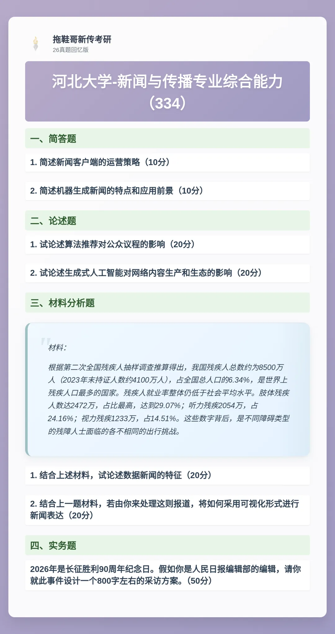在实务与应用维度上,考题聚焦“技术的伦理反思”与“策略的创新构建”。这集中体现在对“算法推荐”、“生成式人工智能”的反复考查上。无论是学硕的“智能时代内容生产的人机偏向”,还是专硕的“算法对公众议程的影响”、“生成式AI对内容生态的影响”,都超越了单纯的技术介绍,要求考生进行辩证分析:既要看到效率提升与模式创新,也必须警惕其带来的信息茧房、伦理失范、新闻专业性消解等风险。334卷中针对“长征胜利90周年”设计采访方案,则考查了在重大主题报道中,如何将历史记忆、主流价值与创新传播形式相结合的策略性思维。