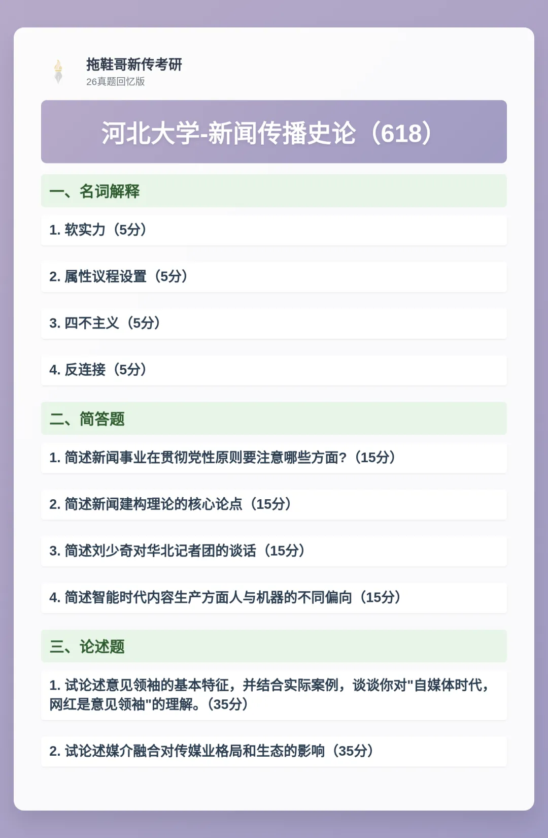 纵览2026年河北大学新传学硕(618/827)与专硕(334/440)的试题,我们可以清晰地感受到它既密切关注着由算法与人工智能驱动的传播业态新变化,又坚实扎根于新闻学与传播学最核心的理论、历史与原则之中。更引人注目的是,今年试卷在题型上的一个显见变化:专硕新增了“名词解释”题型,这一调整不仅增加了基础知识的考查比重,更对考生理论掌握的精准度与系统性提出了更高要求。