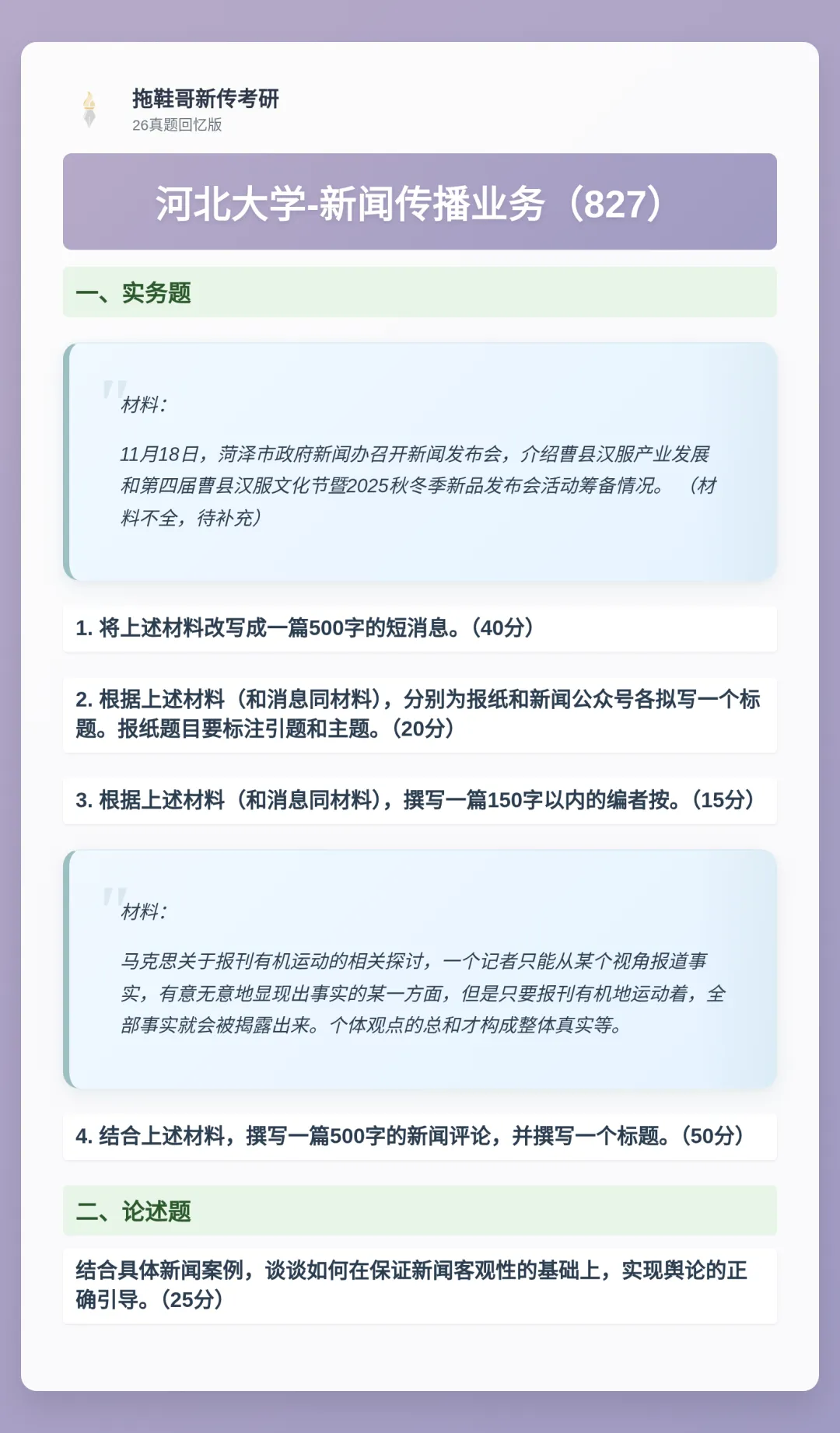 从消息、评论、标题、编者按,到报道策划、采访方案、可视化设计,河大对实务的考查覆盖了新闻生产的全链路。更重要的是,这些实务题都有着强烈的场景设定(如“人民日报编辑”、“长征纪念”、“数据新闻处理”)。这要求考生不仅掌握格式,更要具备在特定传播目标、媒体定位与受众特征下,进行创造性策划与专业性表达的能力。