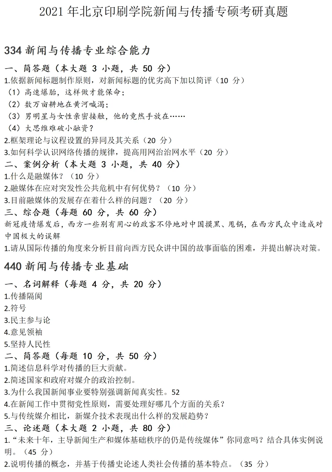 >北京印刷学院新闻与传播考研真题2021