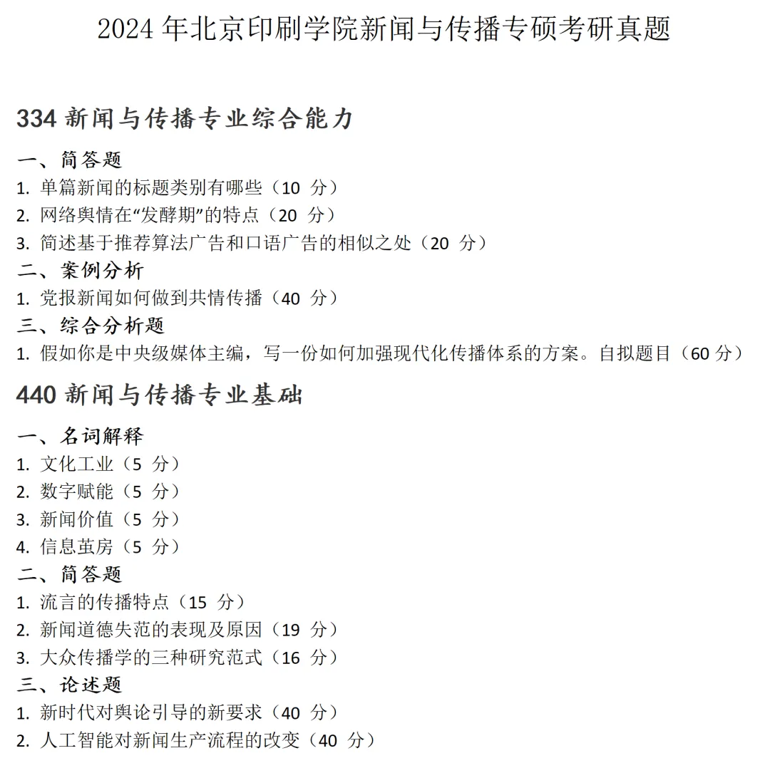 >北京印刷学院新闻与传播考研真题2024