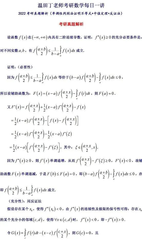 2022考研真题解析(单调性判别法证明不等式+中值定理+反证法)