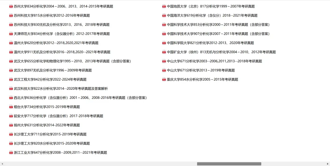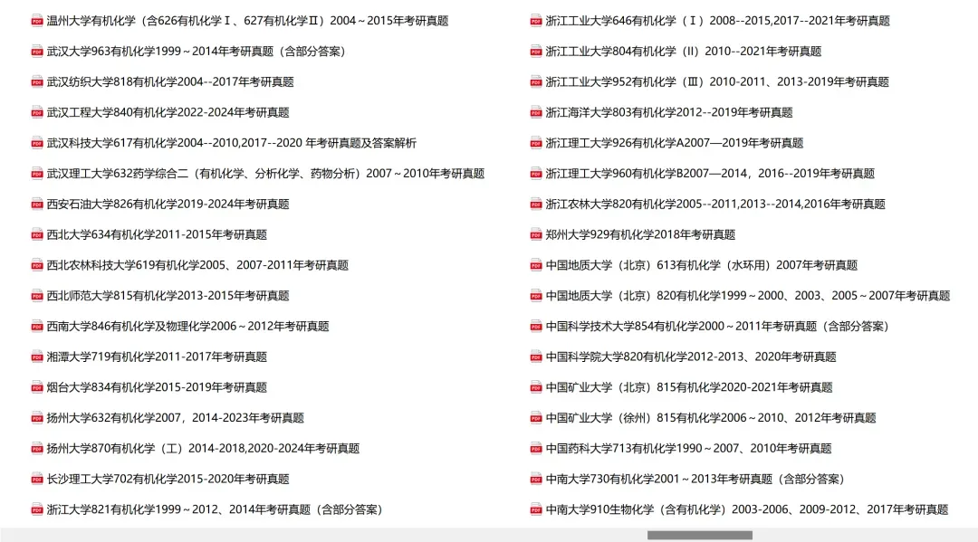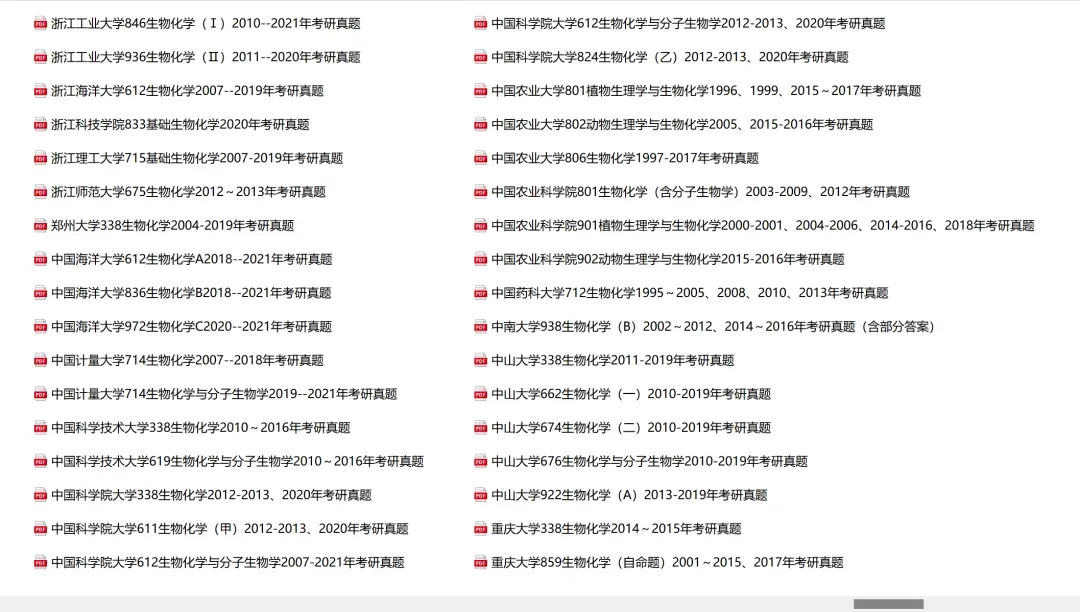 安徽大学631生物化学2007-2010、2012-2017、2019、2021年考研真题 安徽师范大学943生物化学2018年考研真题 北京工业大学886生物化学2009-2011年考研真题 北京化工大学870生物化学2000-2001、2006、2008-2010、2012、2015-2016年考研真题 北京交通大学617普通生物化学2007-2008、2010-2015年考研真题 北京科技大学628生物化学与分子生物学2007-2014年考研真题 北京理工大学625生物化学(A)2005-2008、2010-2011、2013-2015、2019年考研真题(含部分答案) 北京理工大学832生物化学1999-2008、2011、2014-2015年考研真题 北京林业大学714生物化学与分子生物学2005-2006、2014年考研真题 北京林业大学836生物化学2005-2006、2014年考研真题 北京师范大学773生物化学与分子生物学1998-2010、2013、2015、2018-2019年考研真题 常州大学338生物化学2022年考研真题 常州大学825生物化学原理2015,2017,2019-2021年考研真题 大连工业大学338生物化学2017年考研真题 大连工业大学814生物化学2017年考研真题 大连工业大学815食品生物化学2013-2017年考研真题 大连工业大学815食品生物化学2017年考研真题 大连理工大学880生物化学及生物化学实验1999-2005、2010-2013年考研真题 东北师范大学853基础生物化学1998-2017年考研真题 东华大学848生物化学2007、2009~2010年考研真题 福州大学614生物化学(生工)1999-2005、2009、2012年考研真题 复旦大学727生物化学(理)2001-2009、2012-2014、2016-2019年考研真题(回忆版) 复旦大学760生物化学(一)2001-2004、2006、2011年考研真题(回忆版) 复旦大学911生物化学(二)2000-2004、2011、2015-2016、2018年考研真题(回忆版) 赣南师范大学628生物化学2013--2020年考研真题 广东工业大学868基础生物化学2020--2021年考研真题 广东海洋大学619普通生物化学2016-2017年考研真题 广东海洋大学804生物化学2007、2009、2012、2014年考研真题 广东海洋大学806生物化学和食品技术原理2009、2012-2013年考研真题 广西大学839生物化学(自命题)2003-2008、2010、2018年考研真题 广西民族大学338生物化学2023-2024年考研真题 广西民族大学624生物化学2015、2017-2018、2020-2024年考研真题 广州大学821食品生物化学2017-2018年考研真题 贵州大学624生物化学2004~2008、2014~2015年考研真题 桂林电子科技大学822生物化学2014--2016,2018年考研真题 桂林理工大学338生物化学2023-2024年考研真题 国防科技大学817生物化学2015-2016、2018年考研真题 哈尔滨工业大学811食品生物化学2010-2014年考研真题 杭州电子科技大学893生物化学2012--2021年考研真题 杭州师范大学837生物化学Z 2006-2020年考研真题 合肥工业大学811生物化学(二)2006-2008、2012、2014-2015年考研真题(含部分答案) 合肥工业大学840生物化学(一)2012-2013年考研真题 河北大学338生物化学2014~2016年考研真题 河北大学631生物化学(药)2009-2010、2013--2019年考研真题 河北大学635生物化学(重点实验室)2005、2007、2009~2014、2016年考研真题 河北大学850生物化学2005、2007、2009~2011、2013~2016年考研真题 河北工业大学855生物化学2006~2012年考研真题 河北师范大学831生物化学(自命题)2020年考研真题 河南师范大学338生物化学2006,2012--2015,2017--2019年考研真题 河南师范大学625生物化学2017--2019年考研真题 湖南大学851生物化学2005~2010、2012、2014年考研真题(含部分答案) 湖南科技大学338生物化学2020年考研真题 湖南农业大学338生物化学2011-2018年考研真题 湖南农业大学618动物生物化学2008.2014-2018年考研真题 湖南农业大学816生物化学(二)2008-2018年考研真题 湖南师范大学706普通生物化学2008~2010、2013、2018-2019年考研真题 湖南师范大学876生物化学2013-2017年考研真题 华东理工大学805生物化学1998~2008、2010~2017年考研真题(含部分答案) 华南理工大学854微生物生化(含工业微生物学、生物化学)2005~2018年考研真题 华南理工大学874生物化学2004--2018年考研真题 华南理工大学878生物化学与分子生物学2004--2018年考研真题 华南师范大学704生物化学1998-2005、2015-2018年考研真题 华侨大学834生物化学2008-2018年考研真题 华侨大学842生物化学(化工学院)2009--2017年考研真题 华中科技大学952生物化学与分子生物学2003~2009、2012、2014、2016年考研真题 华中农业大学802生物化学1999--2018年考研真题 华中师范大学722普通生物化学1998~2002、2004~2006、2009~2011、2014、2016年考研真题 淮北师范大学851生物化学2014--2015年考研真题 吉林大学651生物化学原理2001~2002、2004、2009~2011、2015年考研真题 暨南大学338生物化学(生物工程(专业学位))2013-2024年考研真题 暨南大学712生物化学A2010-2024年考研真题 江南大学801生物化学(含实验)1998、2001~2017年考研真题 江南大学811生物化学综合2003-2017、2019年考研真题 江南大学835生物化学1997~2001、2003~2013年考研真题 江南大学846生物化学与分子生物学2009-2013年考研真题 江苏大学612生物化学(自)2017-2019年考研真题 江苏科技大学611生物化学2005~2015年考研真题 江苏科技大学844动物生理学与生物化学2017年考研真题 江西农业大学338生物化学2014-2017年考研真题 江西农业大学801生物化学2013-2017年考研真题 江西农业大学803植物生理学与生物化学2013-2017年考研真题 江西农业大学810动物生理学与生物化学2013-2017年考研真题 江西农业大学824食品化学与食品微生物学(食品化学与食品微生物学专业)2013-2017年考研真题 江西师范大学750生物化学2012-2018年考研真题 江西师范大学858普通生物化学