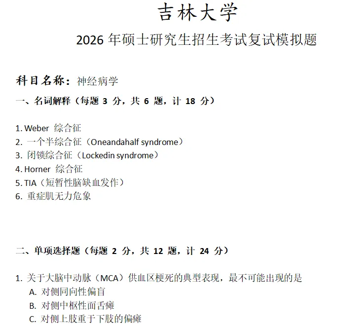 吉林大学神经病学考研复试真题模拟含答案